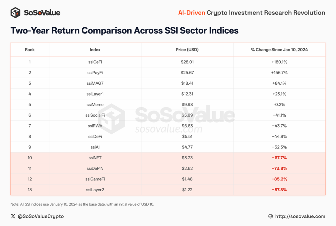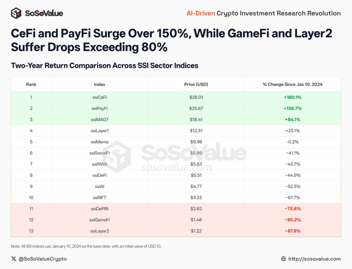图 1:SSI 加密指数两年期回报出现极致分化:CeFi、PayFi 涨幅超 150%,GameFi、Layer2 回撤逾 80%(数据来源:SoSoValue)