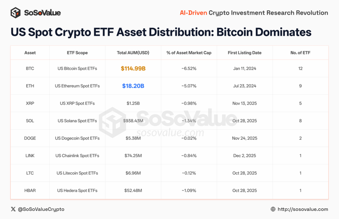 图 2:合规资金偏好清晰:比特币独占主导,其它资产未获规模配置美国现货加密 ETF 资产分布,数据来源:SoSoValue)