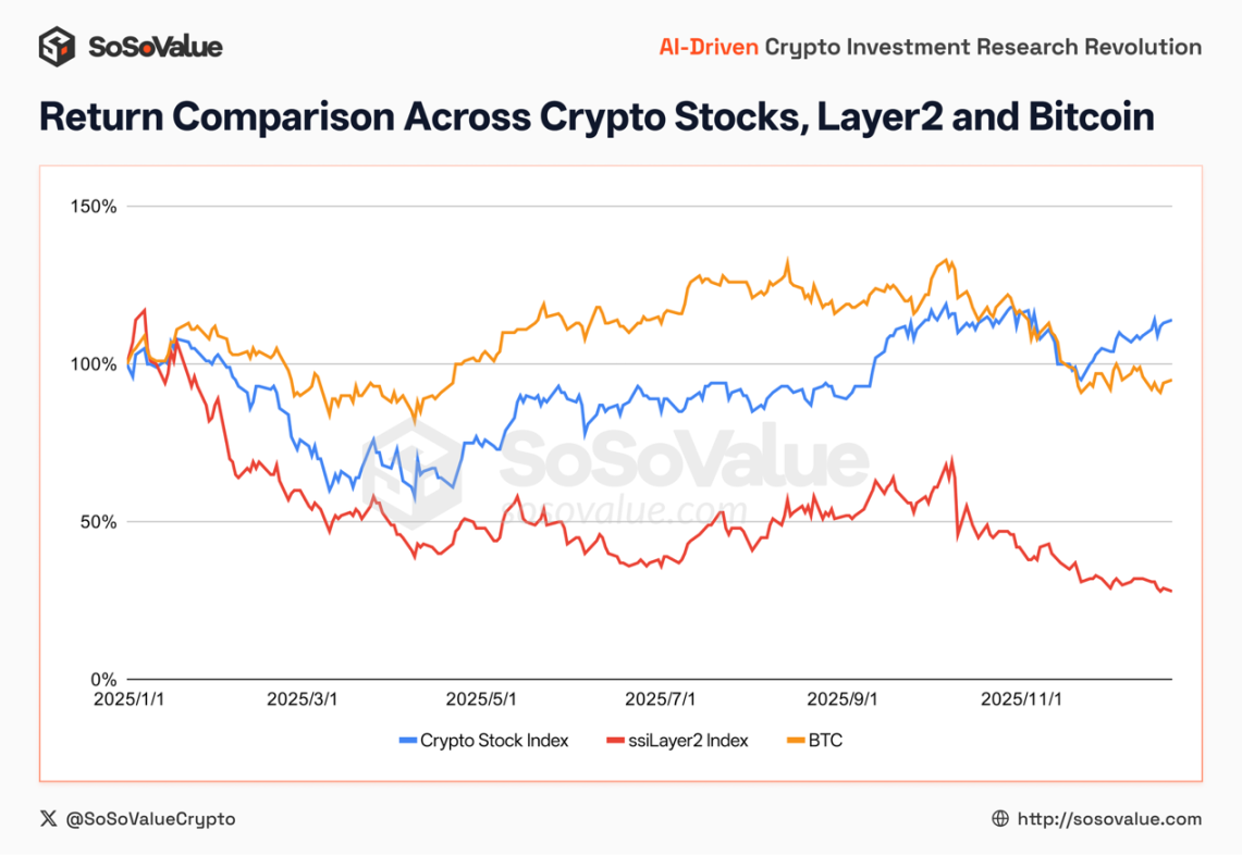 图 4:风险资金外移至美股:加密概念股走强,链上资产如 Layer2 则持续失血(数据来源:SoSoValue)