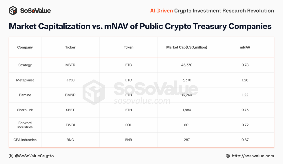 图 5:上市加密资产储备公司的市值与 mNAV 对比(数据来源:SoSoValue)