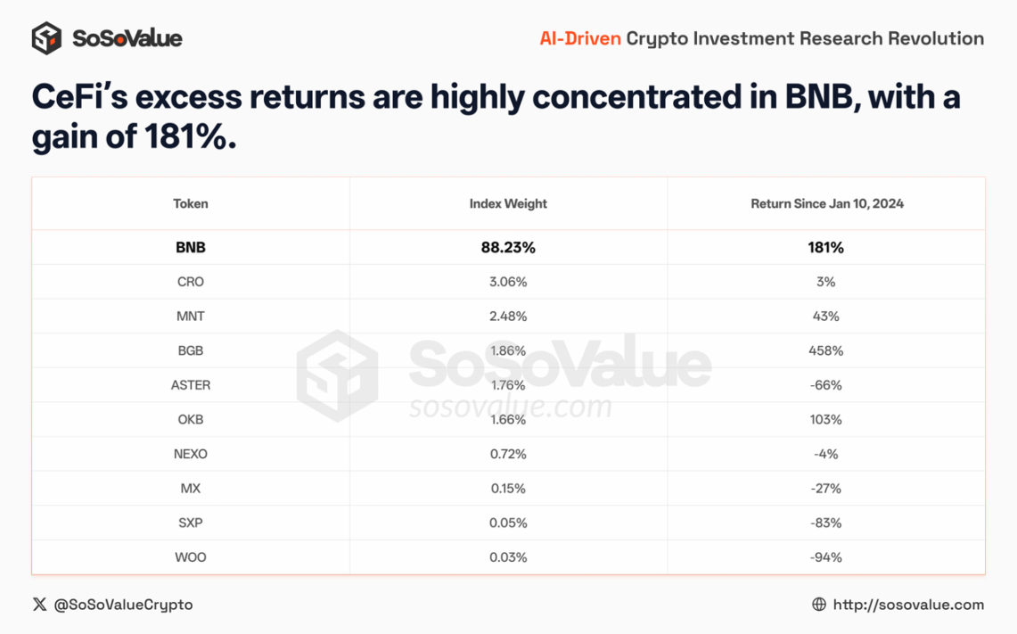图 9:CeFi 的超额收益高度集中于 BNB,涨幅 181%。(数据来源:SoSoValue)