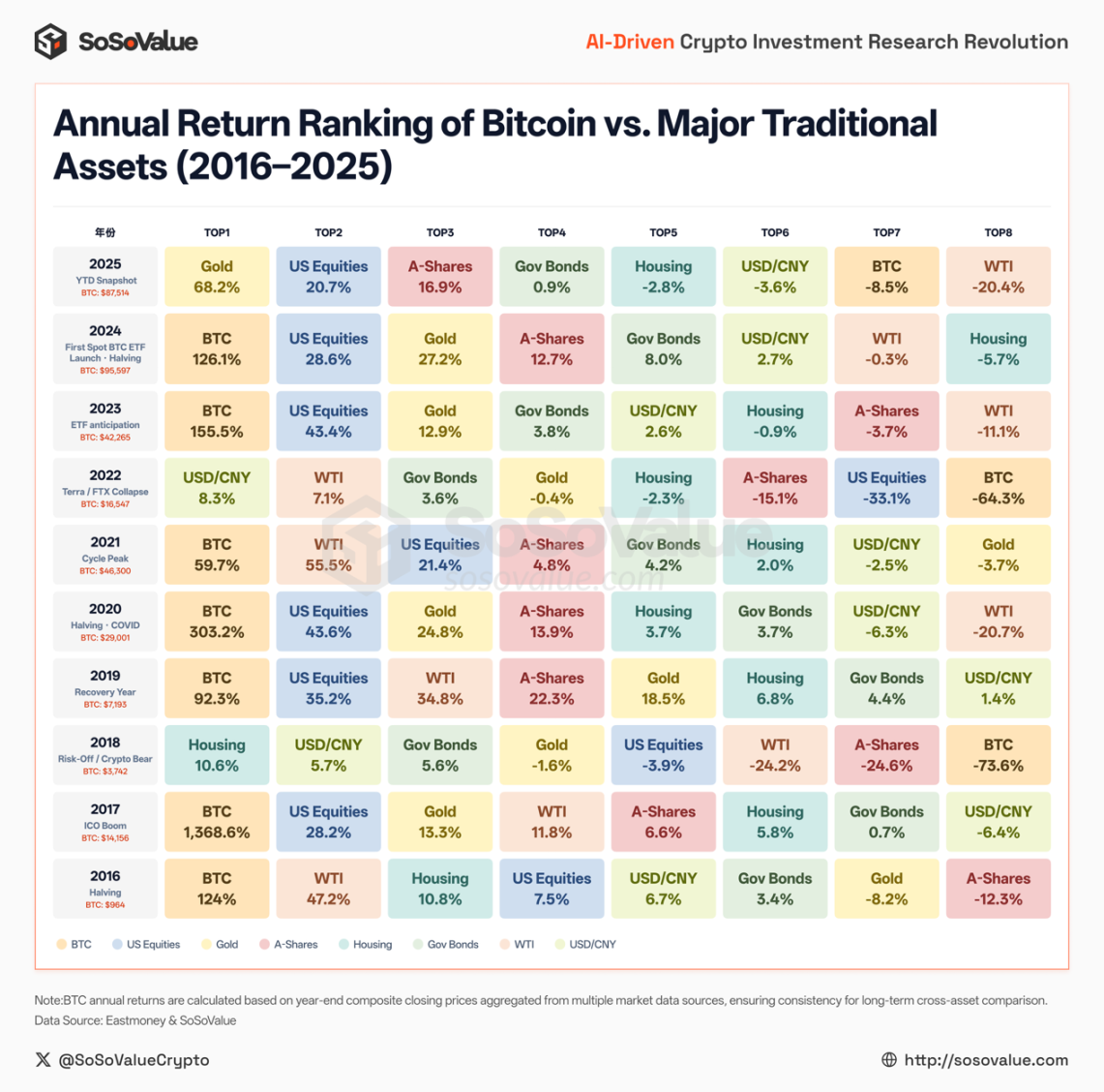 图 10:比特币与主要传统资产年度回报排名对比 (2016–2025)(数据来源:SoSoValue,公开数据整理)