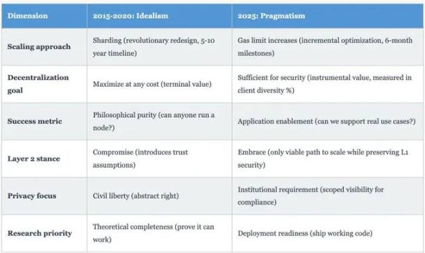 根本性转变:2015 年,以太坊追求去中心化、抗审查性和无需信任作为终端价值(本身就是目标,根植于密码朋克思想)。到 2025 年,这些相同的属性服务于工具价值(实现实际目的的手段,如消除交易对手风险,实现全球金融包容性,并降低运营成本)。这种差异至关重要:理想主义会问「我们能把这个做得多么去中心化?」,实用主义会问「我们需要多少去中心化才能解决这个问题?」 2025 年的阿根廷 Devconnect 揭示了以太坊基金会果断地选择了后一个问题。