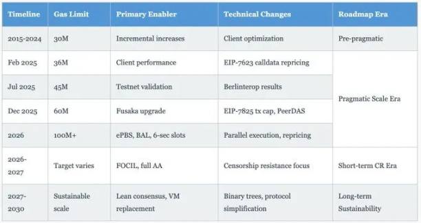 gas limit 扩展策略通过务实的扩展时代(2025-2026)进行,通过增量优化而非架构革命来解决瓶颈。通过客户端性能优化和 EIP-7623 calldata 重新定价(与标准交易的每字节 16 gas 相比,对于高 calldata 比率的 Layer 2 rollups,每字节收取 40 gas)实现的 3000 万到 6000 万的增加,以及 EIP-7825 交易 gas limit 上限(每次交易 1678 万)。该过程分三个步骤进行:30M 到 36M(2025 年 2 月)、36M 到 45M(2025 年 7 月)以及 45M 到 60M(2025 年 11 月),12 月 3 日的 Fusaka 升级对 60M 默认值进行了编纂。此更改与 EIP-4844 在 2024 年 3 月的 Dencun 升级中引入的专用 blob 交易相结合,为 rollups 提供了单独的数据可用性层,同时释放了 Layer 1 执行的区块空间。近期的扩展侧重于增强的 proposer-builder 分离 (ePBS)、支持并行执行的区块级访问列表 (BAL)、有针对性的重新定价,以使 gas 成本与计算实际情况对齐,以及将区块生产率提高一倍的 6 秒 slot 时间。更长期的可持续性(2027-2030)追求精简共识、VM 替换、二叉树状态结构和协议简化,而不是之前计划的 Verkle trees 方法(由于多项式承诺方案中的量子计算漏洞而被放弃)。