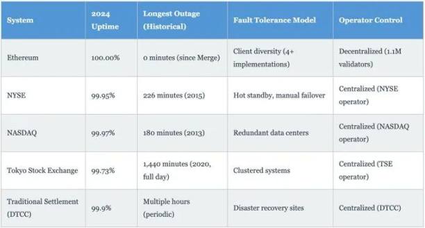 Tomasz Stanczak 的生态系统更新强调,万亿美元市场需要永不停止运行的基础设施。以太坊通过客户端多样性而不是冗余来实现这一点。四个独立的执行客户端(Go 中的 Geth、C# 中的 Nethermind、Java 中的 Besu、Go 中的 Erigon)和五个共识客户端(Prysm、Lighthouse、Teku、Nimbus、Lodestar)确保一个实现中的错误最多影响 60% 的验证者(Geth 当前的市场份额)。在开发人员修补受影响的代码时,网络继续在少数客户端上运行。这种架构与传统交易所形成鲜明对比,尽管采用了复杂的冗余,但传统交易所仍会定期中断。纽约证券交易所 (NYSE) 在 2015 年经历了 226 分钟的中断。东京证券交易所在 2020 年因硬件故障停止交易了一整天。Robinhood 在 2021 年高波动时期经历了多次中断。自 2022 年 9 月合并以来,以太坊已保持 100% 的正常运行时间,每天不间断地处理超过 100 万笔交易。对于考虑区块链基础设施的机构而言,这种可靠性记录超过了传统金融市场标准,同时保持了消除单点故障的去中心化属性。