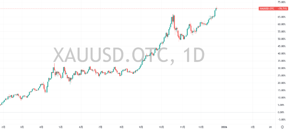 黄金同样表现抢眼,现货金价在 12 月 24 日触及每盎司 4525.18 美元的历史新高,尽管随后回落但全年涨幅依旧超过 70%,有望创下 1979 年以来最佳年度表现,成为一个多世纪以来第二强劲的年度涨幅。