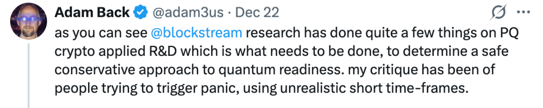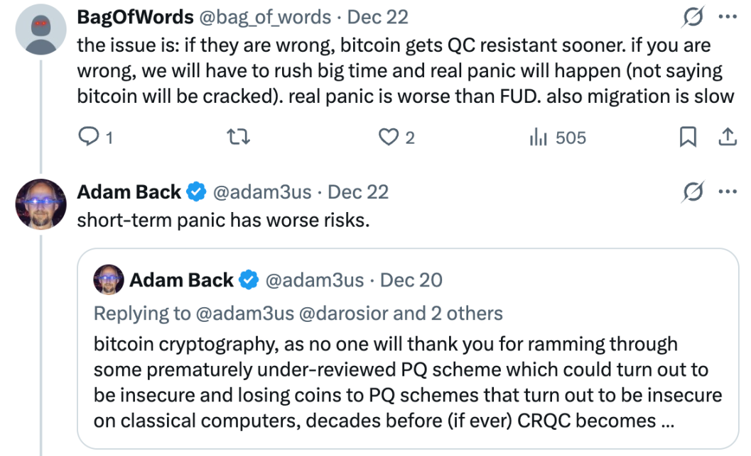 Adam 对此的回答是「短期恐慌会带来更严重的风险」。我们不清楚所谓的风险是价格上的风险还是担心短期的恐慌会让开发者仓促选择一种可能未被充分证明有效的抗量子方案,不过这种回答确实能让人感受到 Nic 所提到的「傲慢」。
