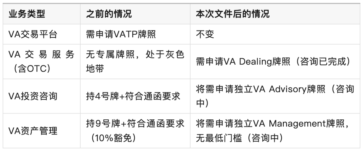 目前,9 号牌持牌公司在管理投资组合时,如果虚拟资产占比低于 10%,可以豁免额外的 VA 相关要求。但新的 VA Management 牌照制度下,只要投资组合中包含任何比例的虚拟资产,都需要申请牌照。