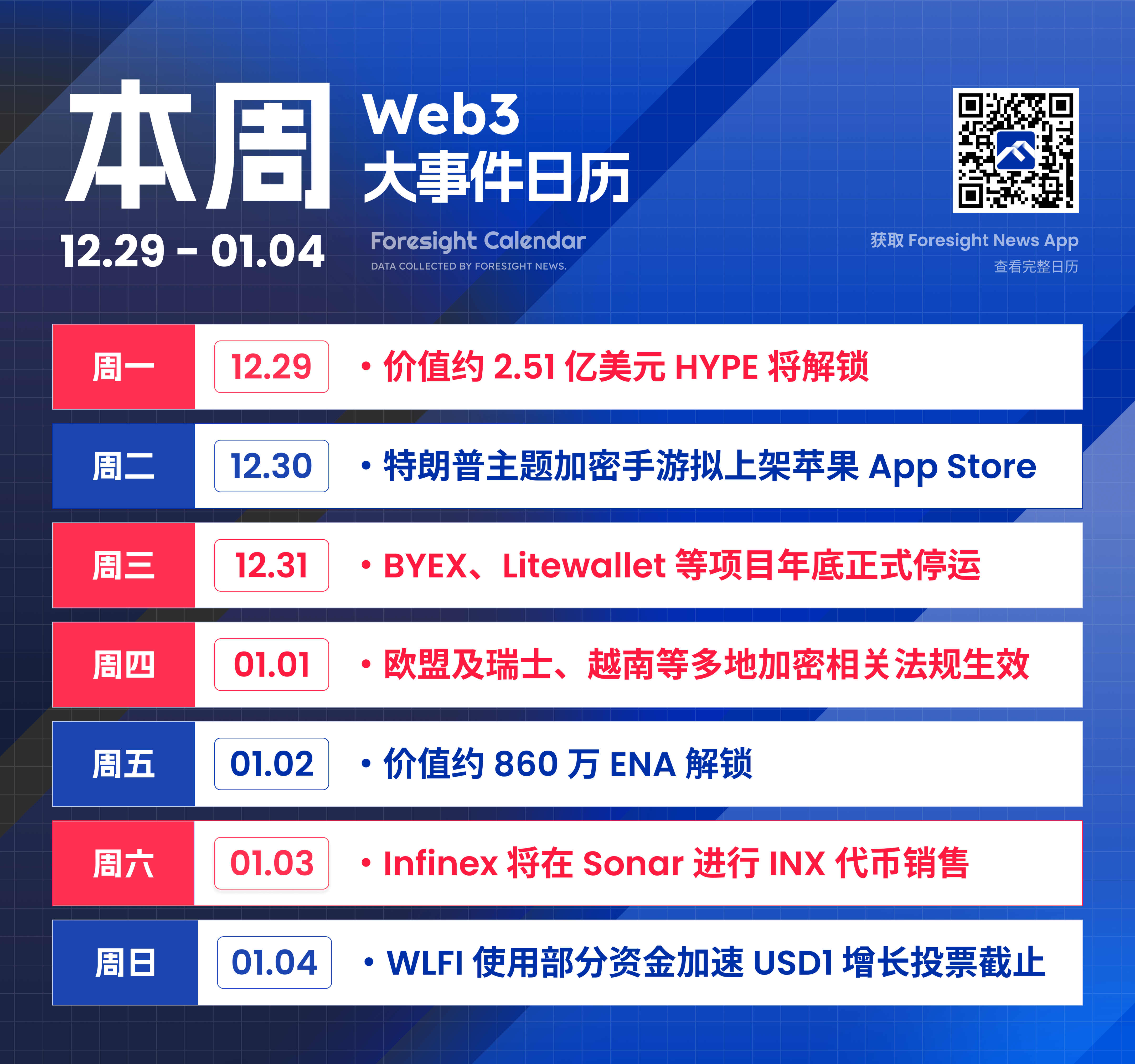 本周(2025 年 12 月 29 日 - 1 月 4 日)Web3 大事件不容错过,下图是本周精彩预告: