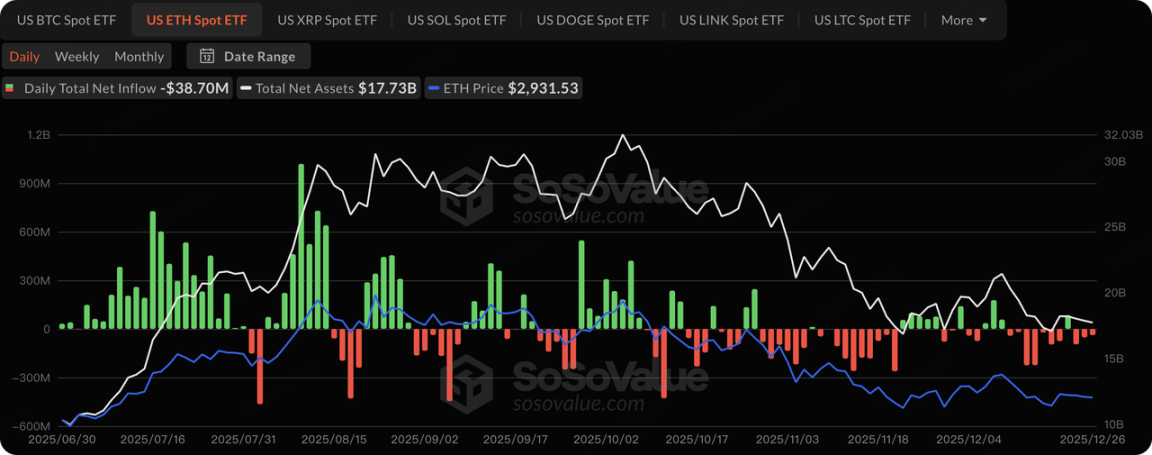 美国 BTC 现货 ETF 在上周出现了较为持续的资金流出,累计净流出约 7.82 亿美元。其中,周五单日净流出达 2.76 亿美元,为假期内流出高峰。所幸,在资金流出的同时,比特币价格仍维持在 8.7 万美元附近,意味着此次资金撤出更可能源于年末资产再平衡与假期流动性下降,而非市场恐慌造成。