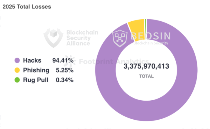 据区块链安全与合规科技公司 Beosin 旗下 Alert 平台监测,2025 年 Web3 领域因黑客攻击、钓鱼诈骗和项目方 Rug Pull 造成的总损失达到了 33.75 亿美元。区块链重大安全事件共 313 起,其中黑客攻击事件 191 起,总损失金额约 31.87 亿美元;项目方 Rug Pull 事件总损失约 1150 万美元;钓鱼诈骗 113 起,总损失金额约 1.77 亿美元。