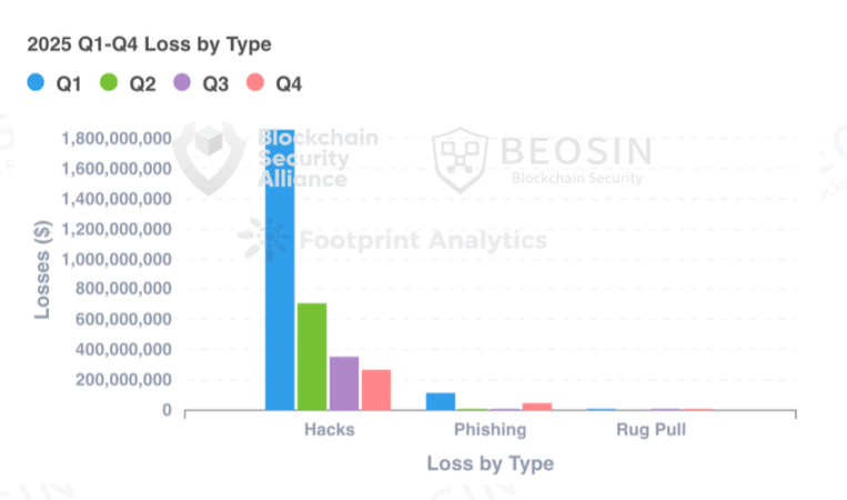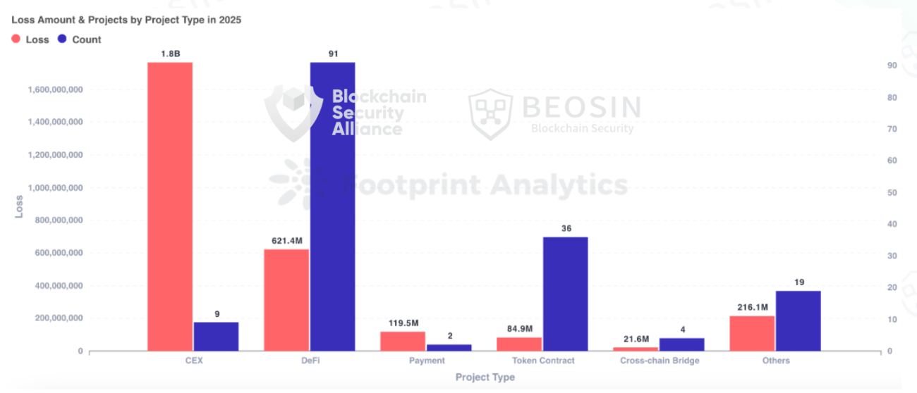 2025 年,钓鱼诈骗、项目方 Rug Pull 所造成的金额损失较 2024 年均有明显下降,然而黑客攻击频发,损失金额超过了 31 亿美元,其中损失最高的项目类型依然为交易所。而私钥泄露相关的安全事件有所减少,造成这一转变的主要原因包括:
