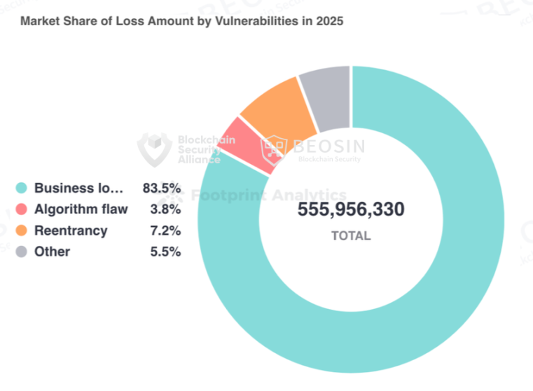 191 起攻击事件里,有 62 次来自于合约漏洞利用,占比达到了 32.46 %,造成的总损失达 5.56 亿美元,是除 Bybit 因供应链攻击外,损失金额最大的一类攻击手段。