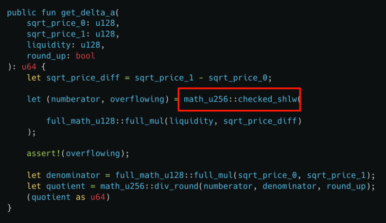 如下图所示, checked_shlw 用于判断 u256 数左移 64 位是否会导致溢出,小于 0xffffffffffffffff << 192 的输入值会绕过溢出检测,但输入值在在左移 64 位后可能会超出 u256 最大值(溢出),而 checked_shlw 仍会输出未发生溢出(false)。这样一来,在后续计算中就会严重低估所需的代币数量。