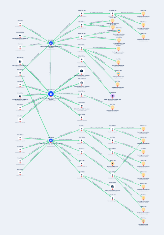 TAoLw5yD5XUoHWeBZRSZ1ExK9HMv2CiPvP、TVNyvx2astt2AB1Us67ENjfMZeEXZeiuu6 与 TPJ1JNX98MJpHueBJeF5SVSg85z8mYg1P1 这 3 个 Wedding 持有的地址共经手 266,761,784.24USDT,一部分资产已被 Tether 官方冻结,但大部分资产已经通过高频次交易的地址和多级转移完成清洗,充值到 Binance、OKX、Kraken、BTSE 等平台。