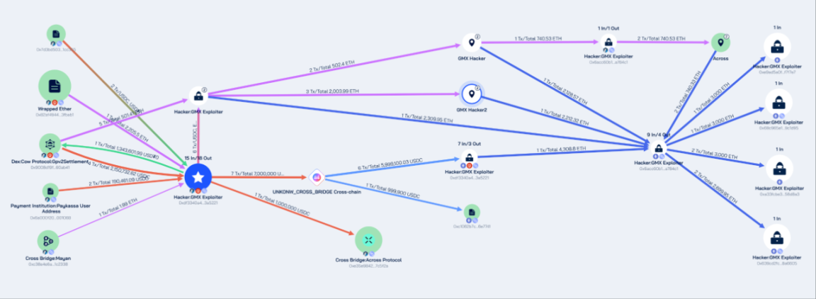 2025 年 7 月 10 日,GMX 因可重入漏洞被攻击,黑客获利约 4200 万美元。Beosin Trace 对被盗资金进行追踪发现:攻击者地址 0x7d3bd50336f64b7a473c51f54e7f0bd6771cc355 在获利后通过 DEX 协议将各类稳定币和山寨币兑换成 ETH 和 USDC,并通过多个跨链协议将被盗资产转移至 Ethereum 网络。