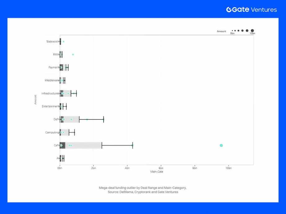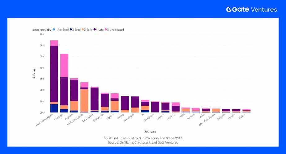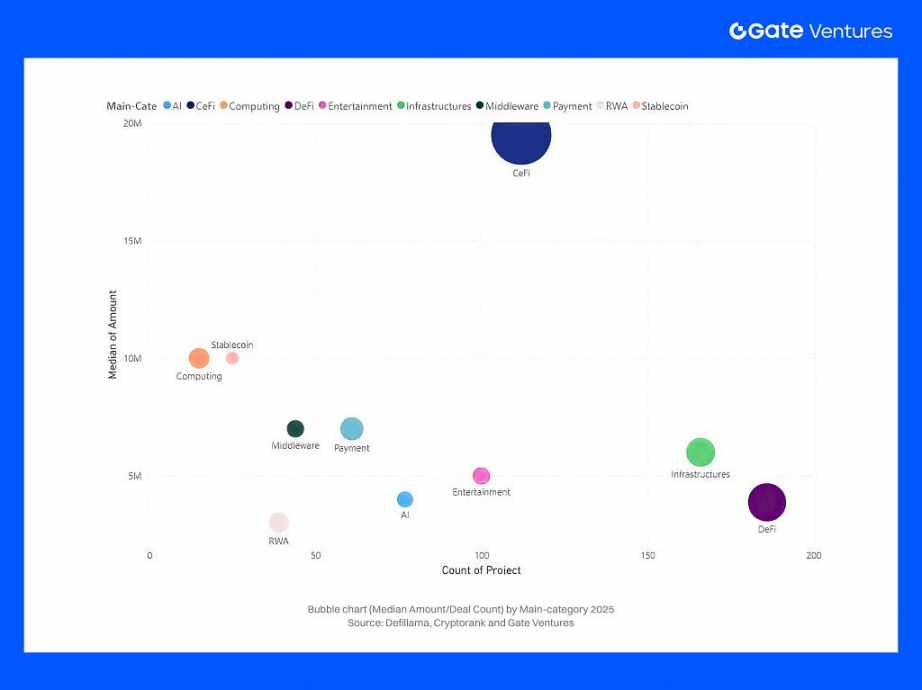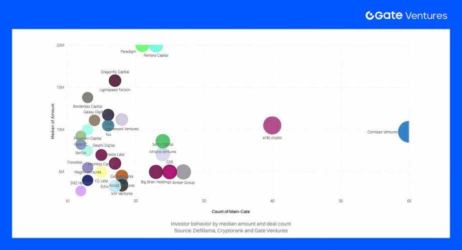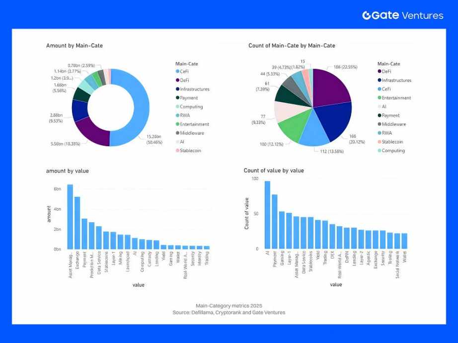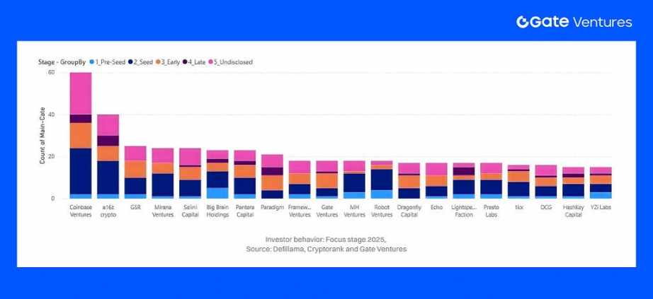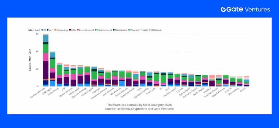 Gate’s dataset shows similar patterns: CeFi/trading is a core focus for Binance, YZi Labs, Coinbase Ventures, and OKX Ventures, who deploy strategically to strengthen exchange ecosystems and liquidity networks.