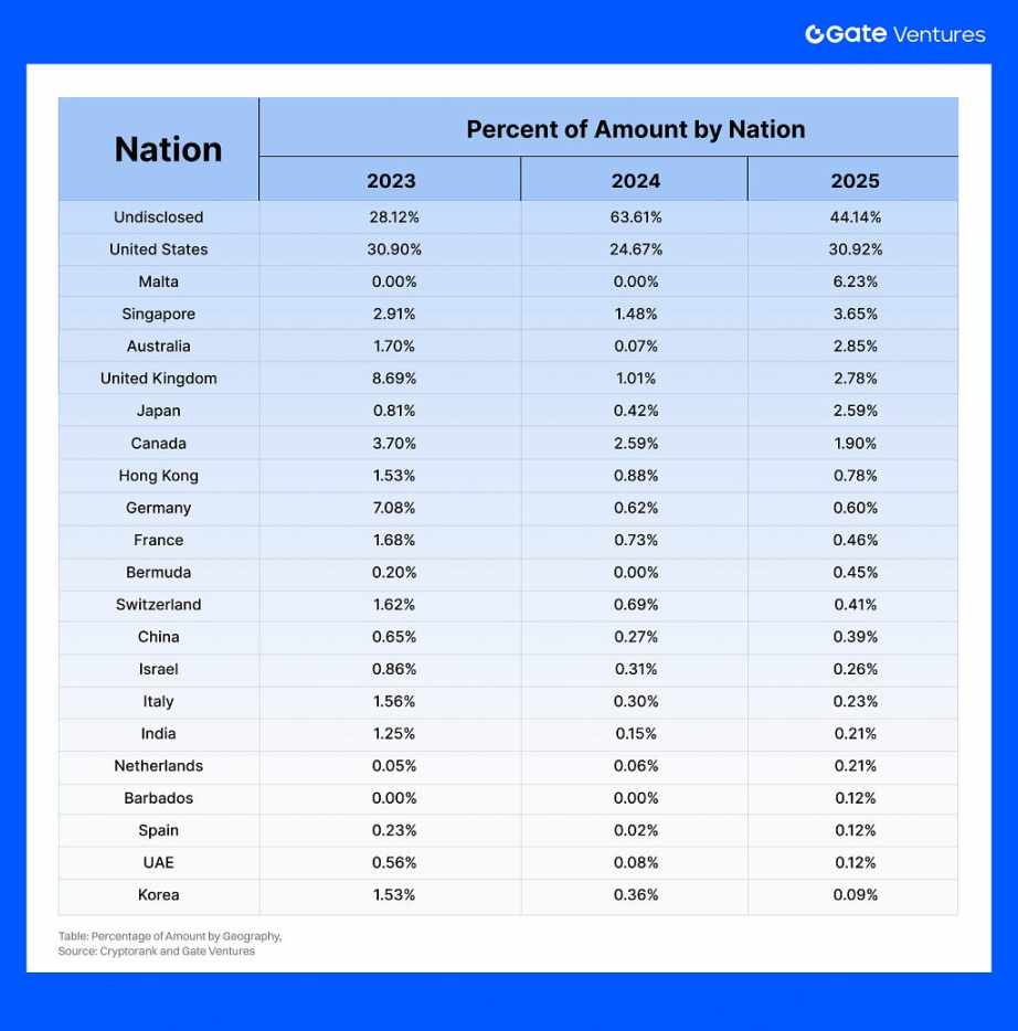A subset of rounds remains geographically unspecified — DAOs, remote teams, or stealth projects. As regulations tightened across 2023–2025, fewer teams stayed jurisdiction-less; many adopted hubs like Singapore, BVI, UAE for clarity.