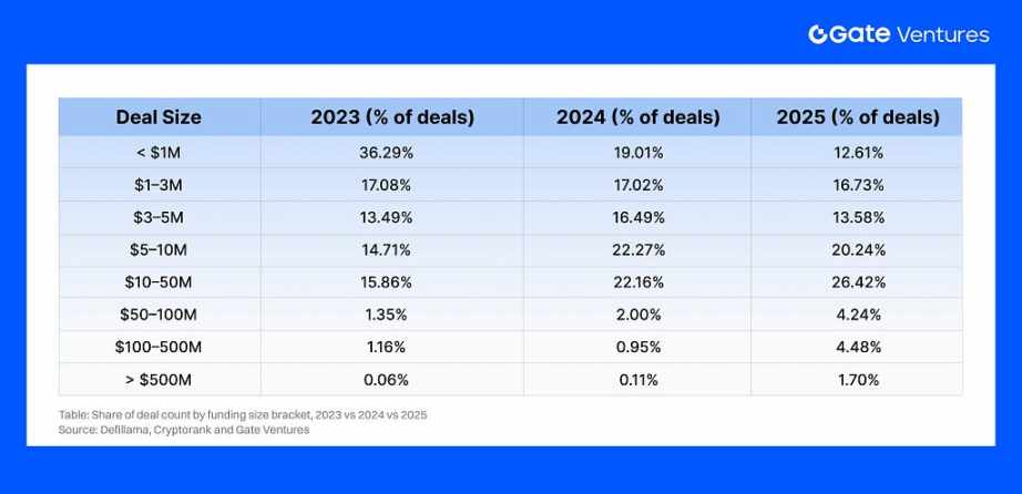 Early-stage was constrained in 2023, as few 2021–22 projects were healthy enough to raise full rounds. Conditions improved in 2024, with median early-stage rising ~26% to ~$4.8M and most rounds falling in the $10–50M range. By 2025, early-stage accelerated as bear-market builders matured. Many early-stage rounds — especially in infrastructure and DeFi — moved into the $10–50M range. Early-stage still dominated deal volume (>24% of all deals), but its share of total capital dropped to ~48%, overtaken by late-stage deployment.