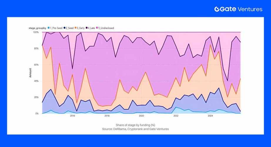 Pre-Seed deal share stayed surprisingly high in 2023–2024, even rising slightly in 2024 — evidence of steady founder activity despite market stress. These rounds were very small in dollar terms, contributing only a few percent of total capital, often involving DAO grants or accelerator-style raises. Crypto-native funds continued backing pre-seed teams for low-cost optionality, keeping this pipeline consistently active.