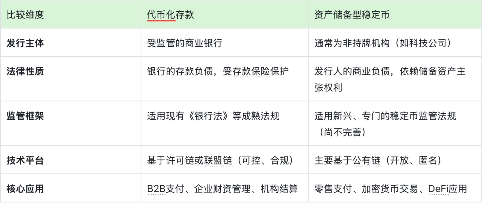 为清晰展示其法律与技术特性的差异,以下是代币化存款与资产储备型稳定币的核心对比: