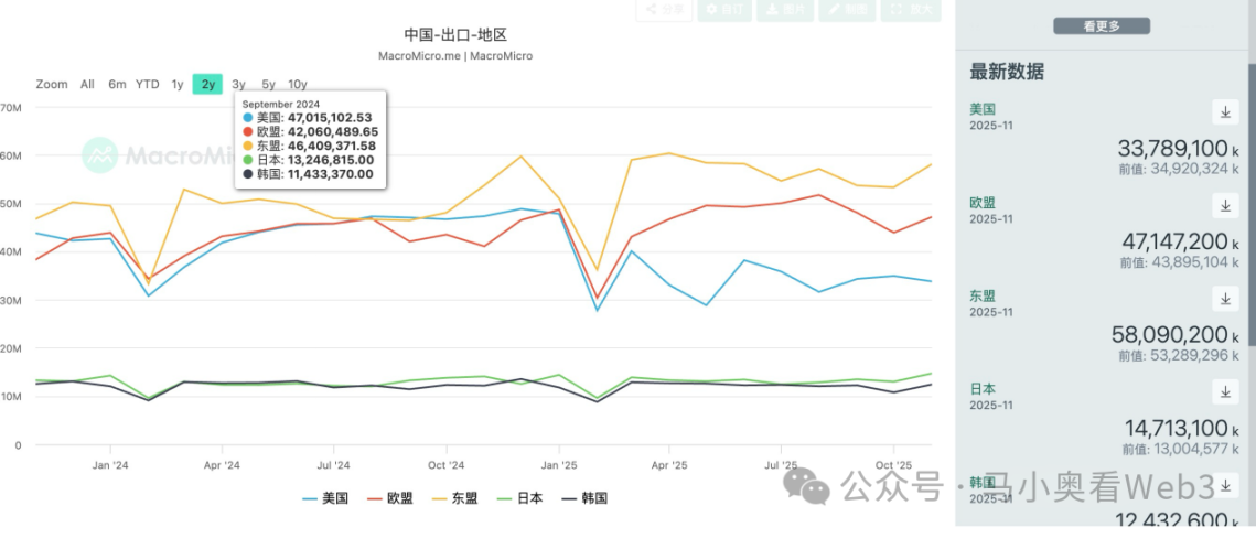我们来看一下中国的出口数据,可以看到,目前在出口占比重最高的三位分别是东盟、欧盟和美国。受贸易战的影响,中国对美国的出口有明显下降的趋势,当然我们不讨论转口问题。而增量贡献中最明显的还是欧盟和东盟。