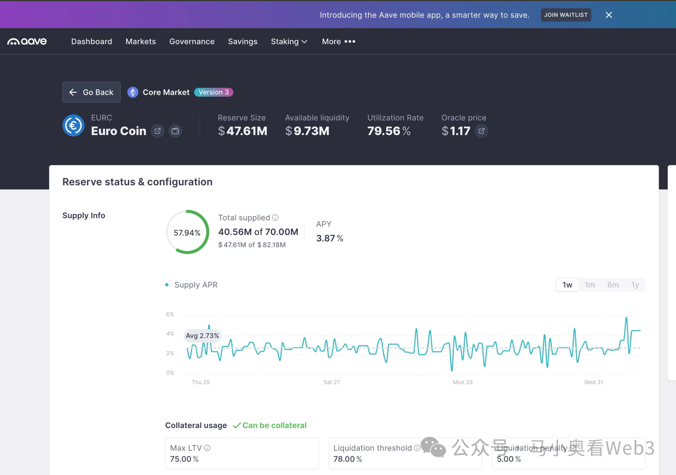 回到汇率对冲策略来说,笔者认为一个切实可行的策略是将美元稳定币兑换为 EURC,然后可以选择存放到 AAVE 等头部平台赚取利息,以当前利用率来看,出借利率可以达到 3.87%,也是比较香的。如果想保持对 BTC 等风险资产的头寸,又想对冲汇率风险,可以选择以 EURC 作为抵押品,借出美元稳定币,再进行资产配置,例如购入 BTC。