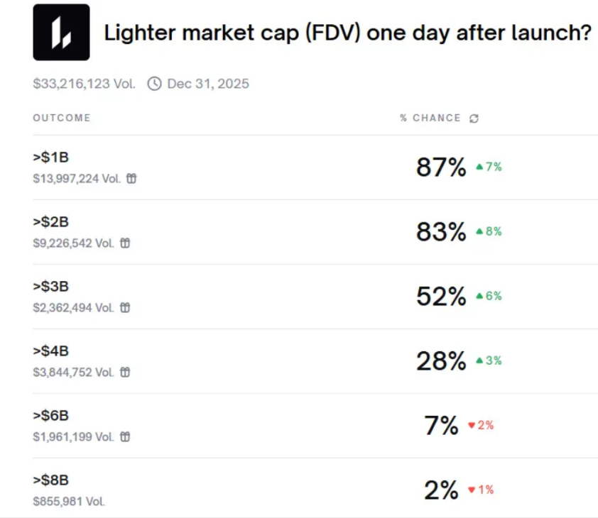 CoinGecko 数据显示,LIT 目前市值约 6.8 亿美元,FDV(全稀释估值)超 27 亿美元。一周前,Polymarket 盘面预测「Lighter 上线次日市值将超 20 亿美元」的概率达 83%。
