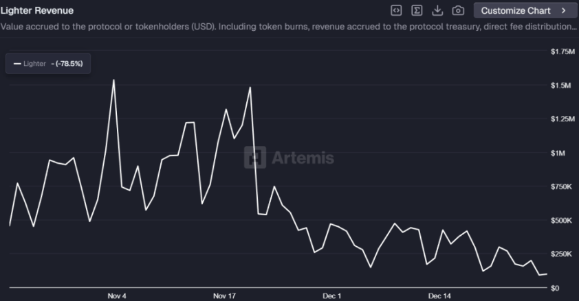 然而,或因市场下行,Lighter 近一周的收入水平有所下滑。代币空投预期已兑现,协议的真实创收能力仍有待观察。