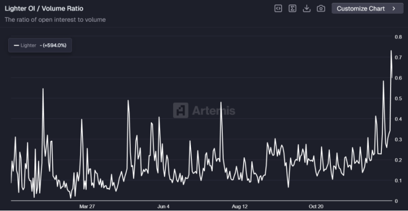 协议夸张的 OI/Vol(持仓量 / 交易量)比率引发了市场广泛的质疑。虽然近日比率有所回升,但 Lighter 曾长期维持着 0.2 上下的比率,这意味着平均每 1 美元的持仓在 24 小时内被反复交易了 5 次左右,显著背离了健康的有机持仓模式(OI/Vol<0.33),表现出明显的刷量特征。