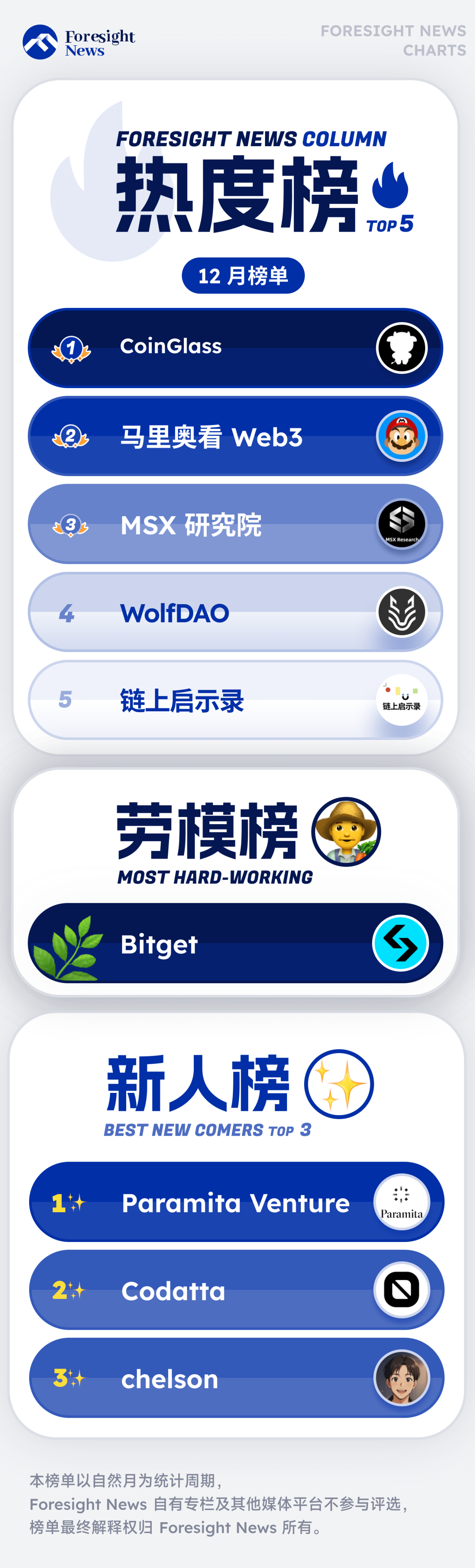 Foresight News 根据 2025 年 12 月份专栏作者文章阅读量、内容质量、发文数量等数据,综合评定出当月热度榜 Top5、劳模榜 Top1 及新人榜 Top3,并附上其专栏下优秀文章推荐: