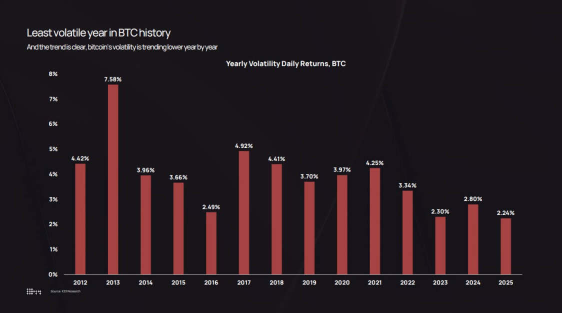 根据 K33 Research 的数据,比特币的年度波动率从 2013 年 7.58% 的峰值下降到 2025 年 2.24% 的历史低点。