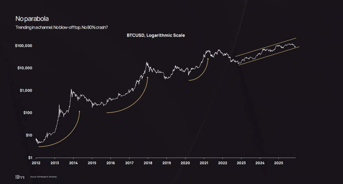 比特币的对数价格图表显示,自 2022 年以来,其价格在上升通道内缓慢上行,避开了早期周期中出现的抛物线式飙升和 80% 的暴跌。