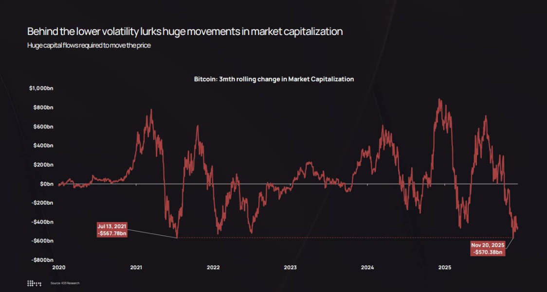 2025 年 11 月,比特币三个月内的市值波动达到 5700 亿美元,尽管波动性较低,但与 2021 年 7 月 5680 亿美元的跌幅相当。