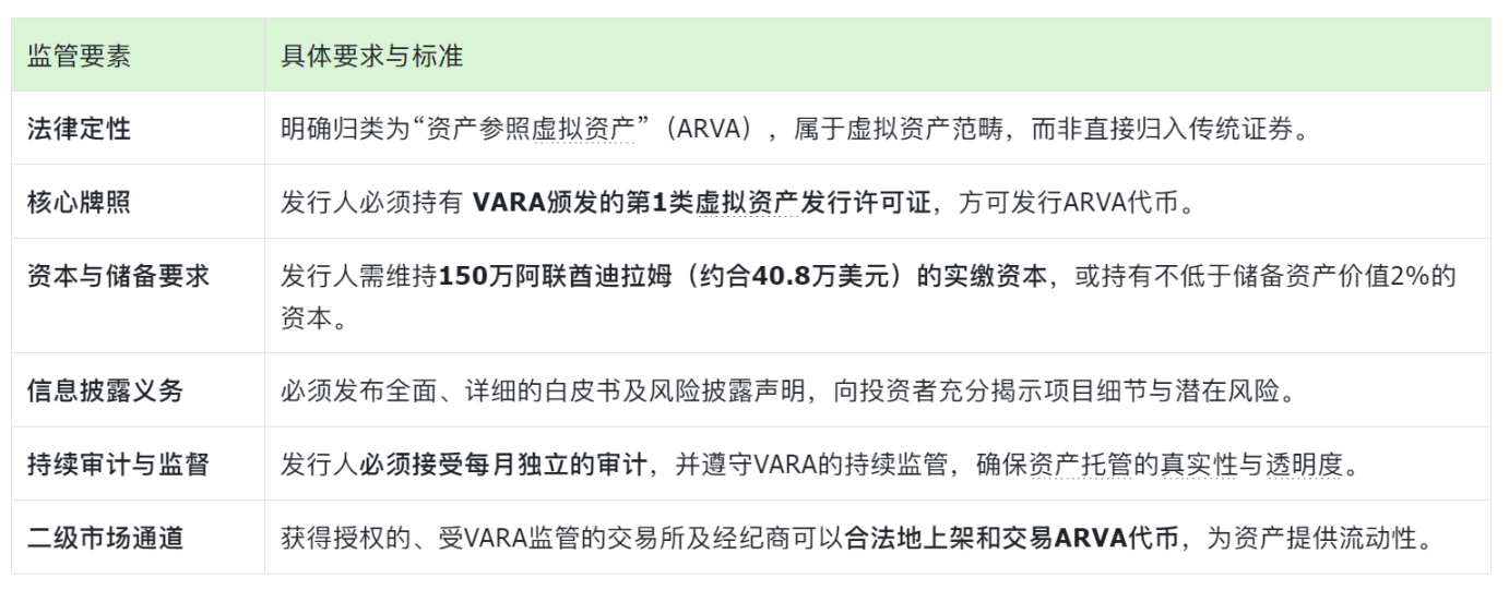 2025 年 5 月,VARA 发布的规则手册更新,为 RWA 量身定制了名为 “资产参照虚拟资产”(ARVA) 的全新类别。根据规则,ARVA 被明确定义为代表对现实世界资产(如房地产、商品)直接或间接所有权、并可分享其收入的代币。