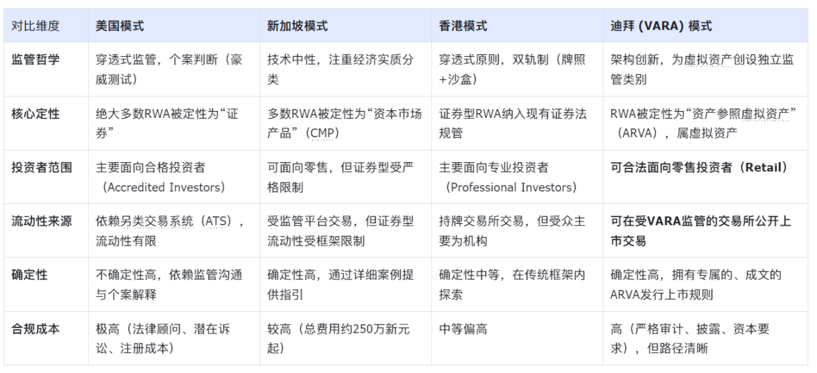 迪拜模式的成功,需要在全球监管版图的对比中才能被更清晰地认知。不同司法辖区基于自身法律传统和金融发展目标,塑造了风格迥异的 RWA 监管哲学。