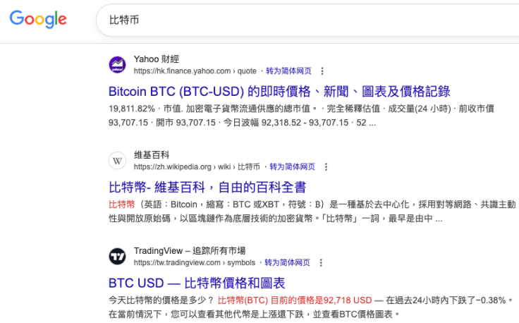 例如当有人搜索关键词「比特币」的时候,搜索引擎可能会依据网站本身的专业性、关键词出现频率和历史用户打开次数等参数来决定提供的搜索结果中每个网站的排名,在笔者自己的谷歌搜索中,雅虎财经、维基百科、TradingView 排名前三位。