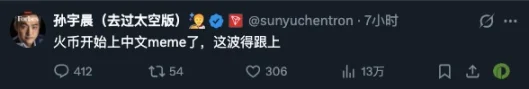 这轮中文 Meme 热潮是从何一的推文中冷启动的,1 月 1 日何一在 X 平台配文「2026,我踏马来了」庆祝新年,随后一个星期,同名 Meme 币开始发酵,最后上线币安 Alpha,引爆了中文 Meme 社区。