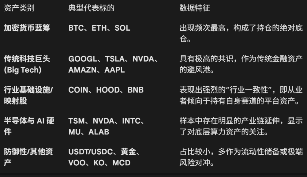 Prompt:你将看到一组来自美股代币化 /Web3 一线从业者们的关键词样本,这些关键词用于回答同一个问题:「你在 2025 年的真实持仓(不限美股 /Web3)」;不要判断对错,也不要引入任何外部市场信息,仅基于样本的构成进行逻辑分析,从数据结构角度解读: