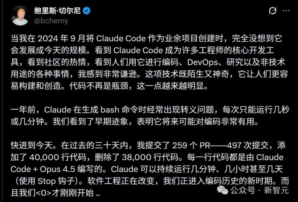 Boris 回忆说,在过去的三十天里,他提交了 259 个 PR——497 次提交,添加了 40,000 行代码,删除了 38,000 行代码。每一行代码都是由 Claude Code + Opus 4.5 编写的。