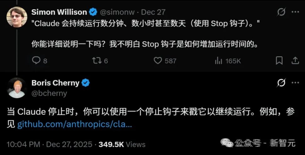 为什么 Claude 可以持续运行好几天?Boris 解释道,当它停止时,可以使用一个停止钩子来「戳」它,让它继续运行。
