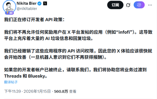 1 月 15 日,X 产品负责人 Nikita Bier 发文称,正在修订开发者 API 规则。奖励用户在 X 平台发帖的应用(例如「Infofi」)将被禁止访问 X API,因其导致了平台上充斥着大量的 AI 垃圾信息和回复。