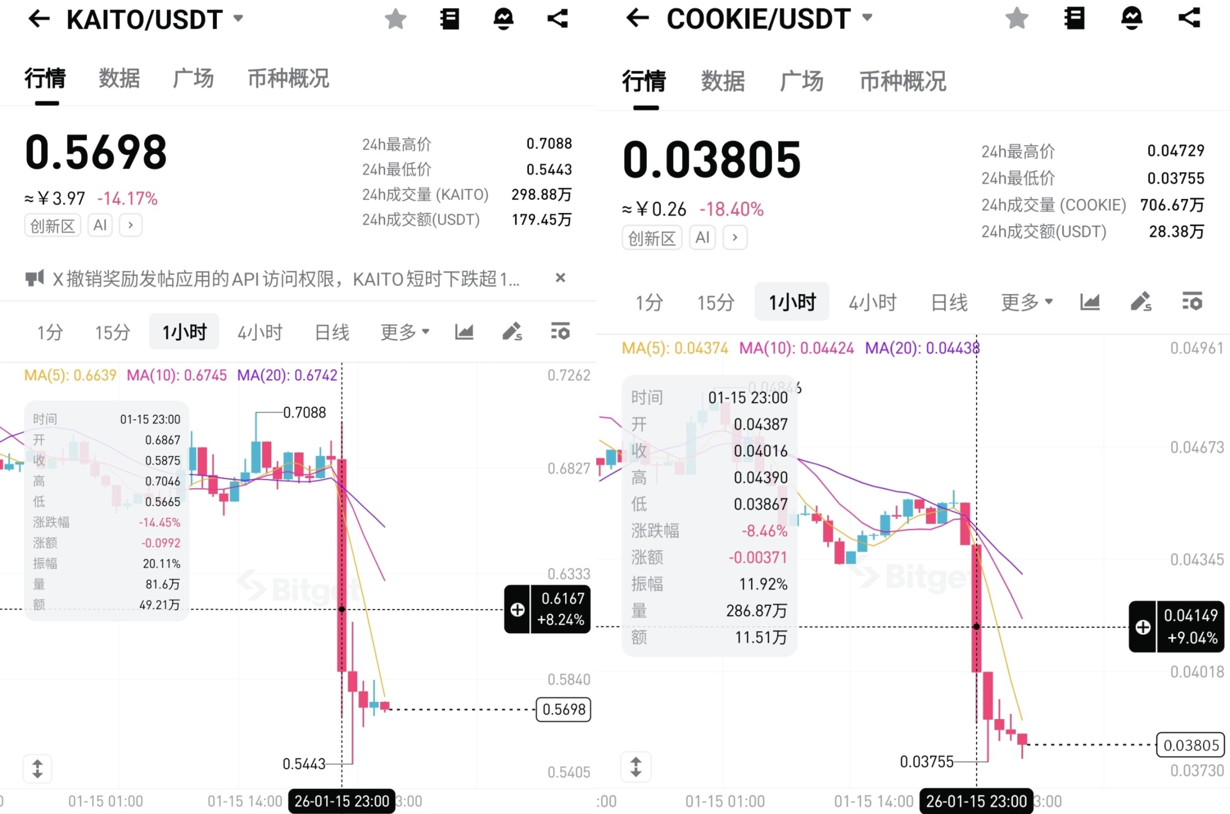 KAITO(左)及 COOKIE(右)1 小时 K 线图 | 图源:Bitget