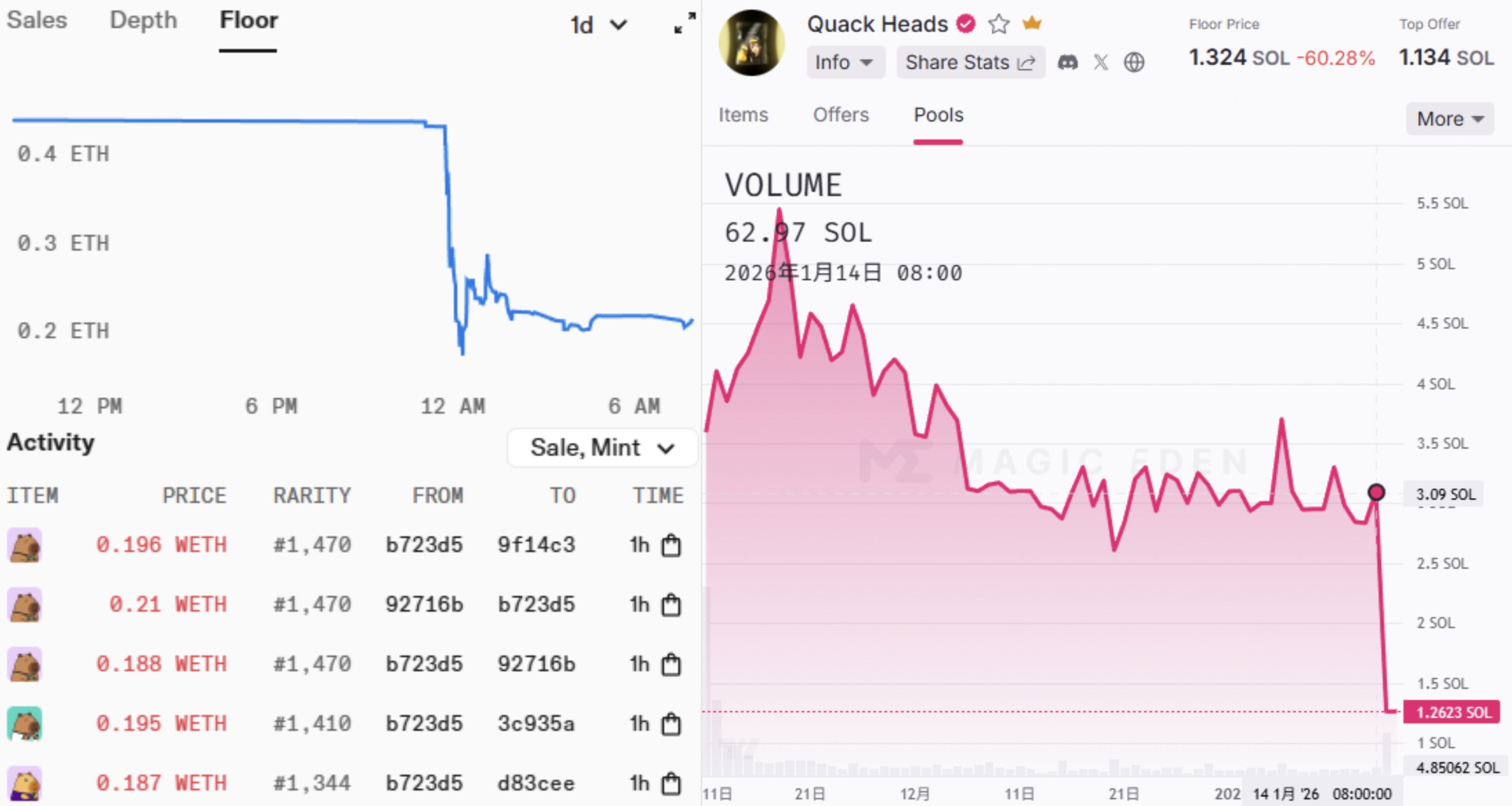 Yapybaras(左)及 Quack Heads(右)NFT 地板价走势 | 图源:OpenSea(左)、MagicEden(右)
