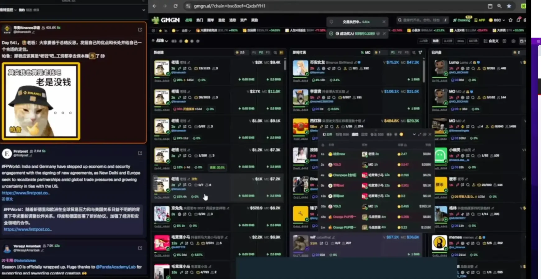 但如果只是装备好,还不足以成为最近的明星交易员。真正让他脱颖而出的,是他在 BNB 链上的操作方式,而这些都能在他的直播中捕捉到一些细节。
