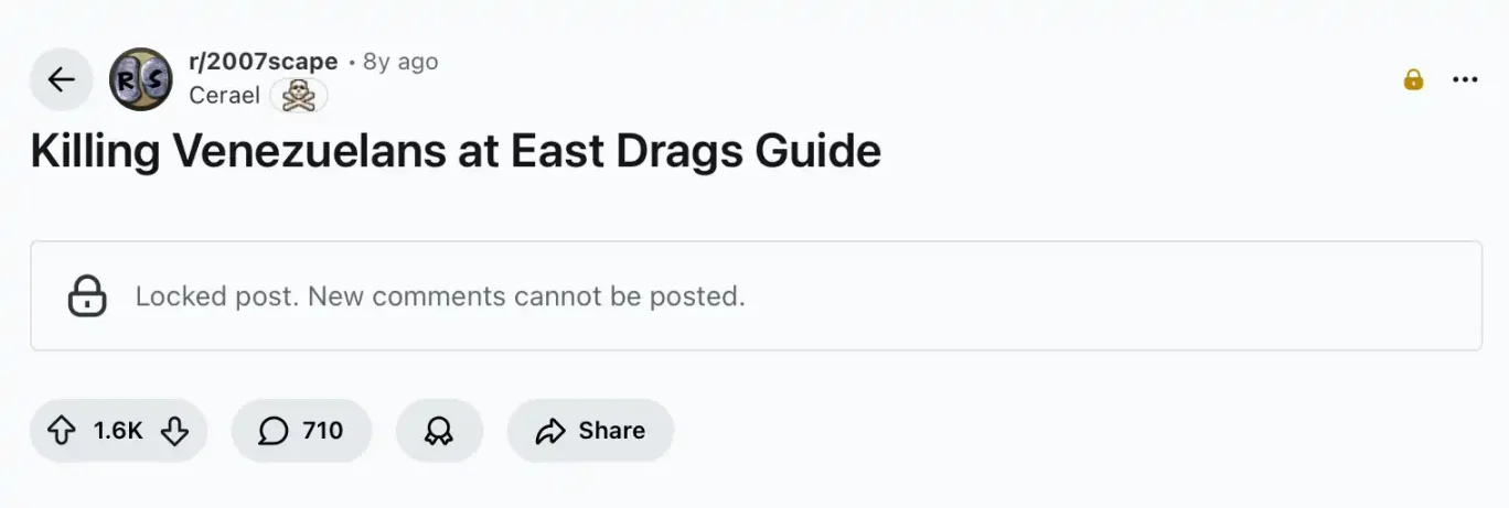 委内瑞拉玩家至少在 2017 年甚至更早的时候就开始利用 OSRS 来解决生计问题,因为在 2017 年 9 月,一篇 Reddit 上教 OSRS 玩家怎么在游戏中的「东部龙区」追杀委内瑞拉玩家的帖子爆火,并且在之后成为了 OSRS 历史中重要的 meme 文化: