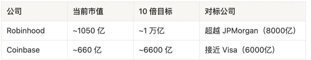 从纯数学角度,Coinbase 的 10 倍目标更容易达到——6600 亿美金大约是 Visa 的体量,而 Robinhood 要 10 倍就得超过 JPMorgan 成为全球最大金融机构之一。
