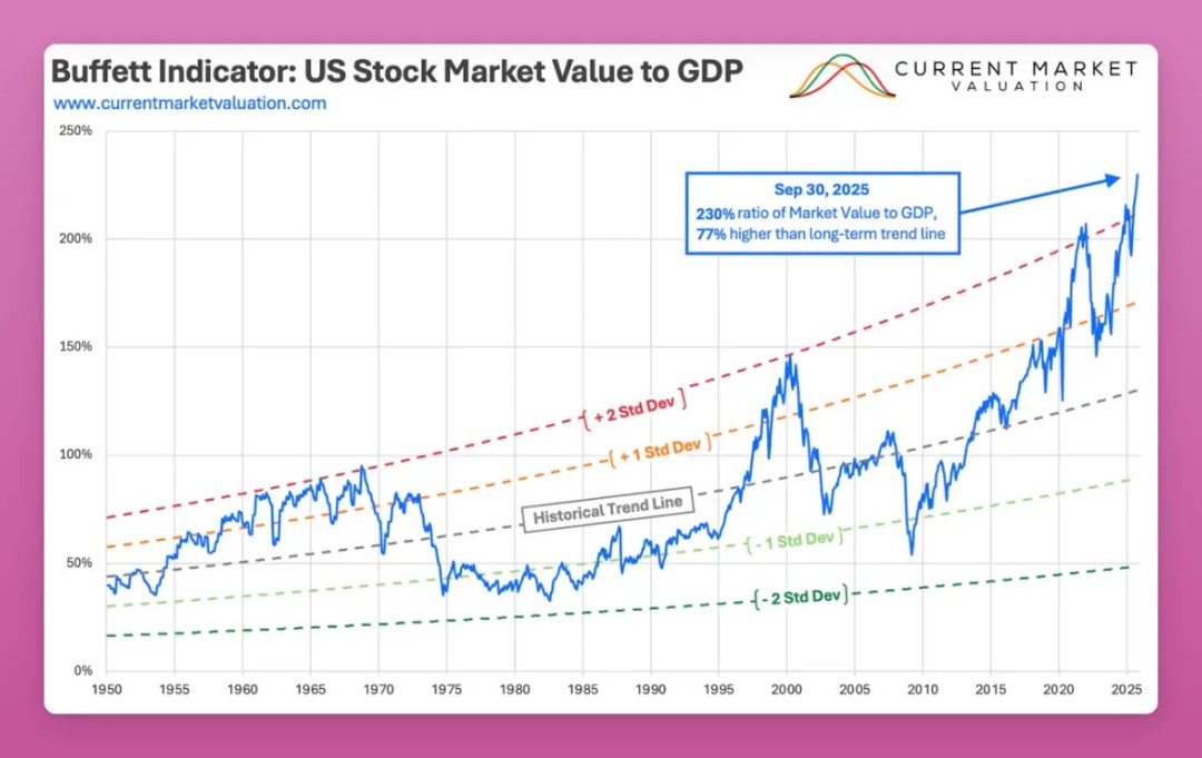 而根据沃伦・巴菲特所说的「衡量任一时刻估值水平的最佳单一指标」—— 股市总市值与 GDP 的比率,当前该比率已达到 230%,较长期趋势高出 77%,而 1929 年崩盘前这一比率仅为 130%。