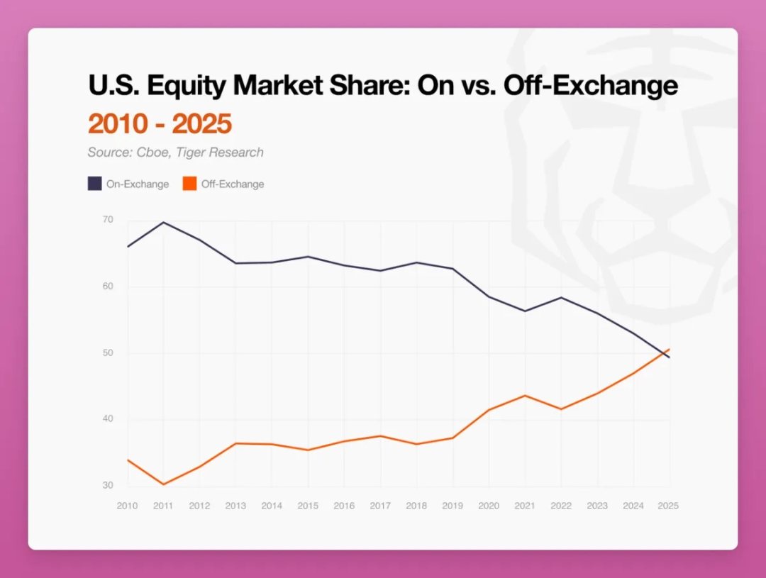 看看 Tiger Research 的图表:美国股票市场的「场内交易占比」从 2010 年的约 70%,降至 2025 年的近 50%,场外交易占比已与场内持平。彭博社报道称,目前美国大部分股票交易都发生在「暗池」(场外市场)。