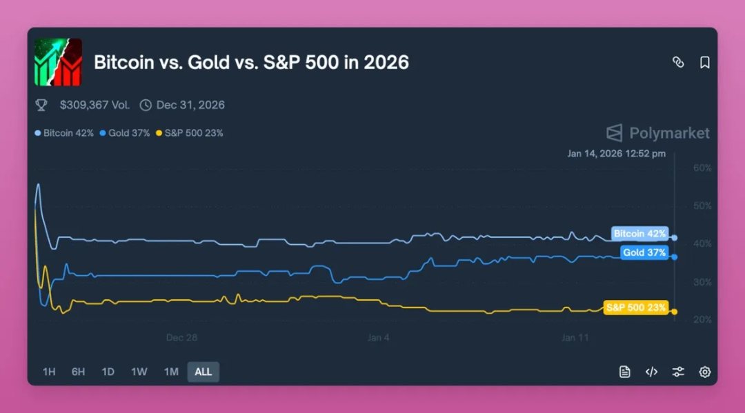 Polymarket 的数据显示,2026 年比特币有望跑赢黄金和标普 500 指数,但三者之间的竞争将非常激烈。